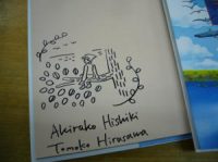 写真が横向きでゴメンナサイ! こちらが今回の『巨人の花よめ』(1600円+税)にいただいた菱木晃子さん&平澤朋子さんのダブルサインです。絵はもちろん平澤さんの直筆で、かわいいチャルミを書いてくださいました。上の文字はスウェーデン語の原書タイトル“Stalobruden(スタロブルーデン)”で、これは菱木さんが入れてくださいました。こちらを限定50冊販売しています。ぜひ原画展を見た記念にお買い求めくださいませ。